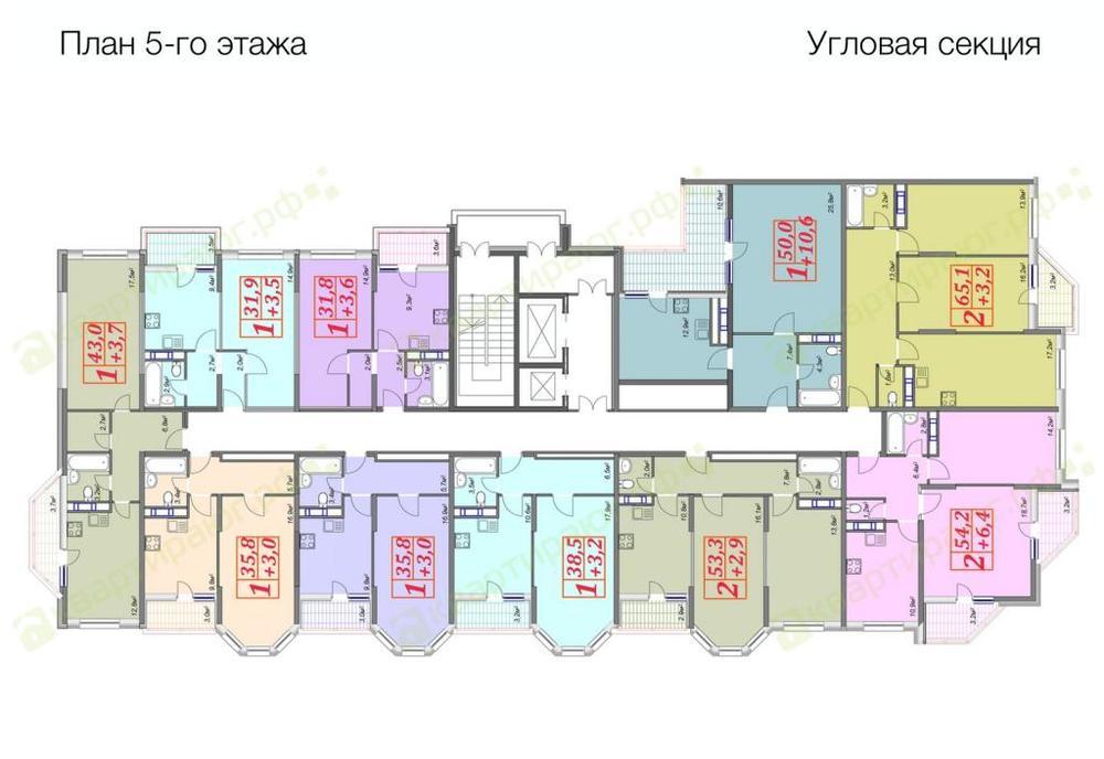 Три секции по 13 этажей, расположенные друг к другу буквой «Г». Цокольный этаж эксплуатируемый, будет использоваться под коммерцию. Две секции имеют одинаковые планировки по 6 однокомнатных и 2 двушки на этаже, третья секция вмещает 7 однокомнатных квартир и 3 двухкомнатные на одной площадке. Двухкомнатные квартиры оборудованы двумя санузлами, как говориться, красиво жить не запретишь! В каждом подъезде по два лифта, грузовой и грузопассажирский.