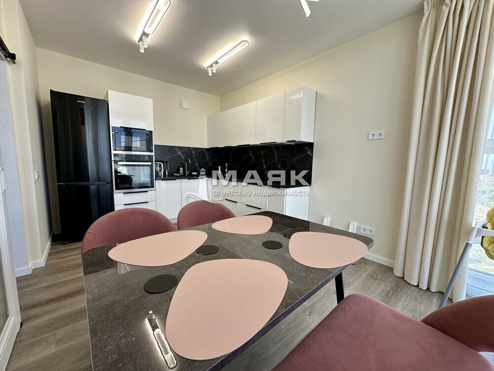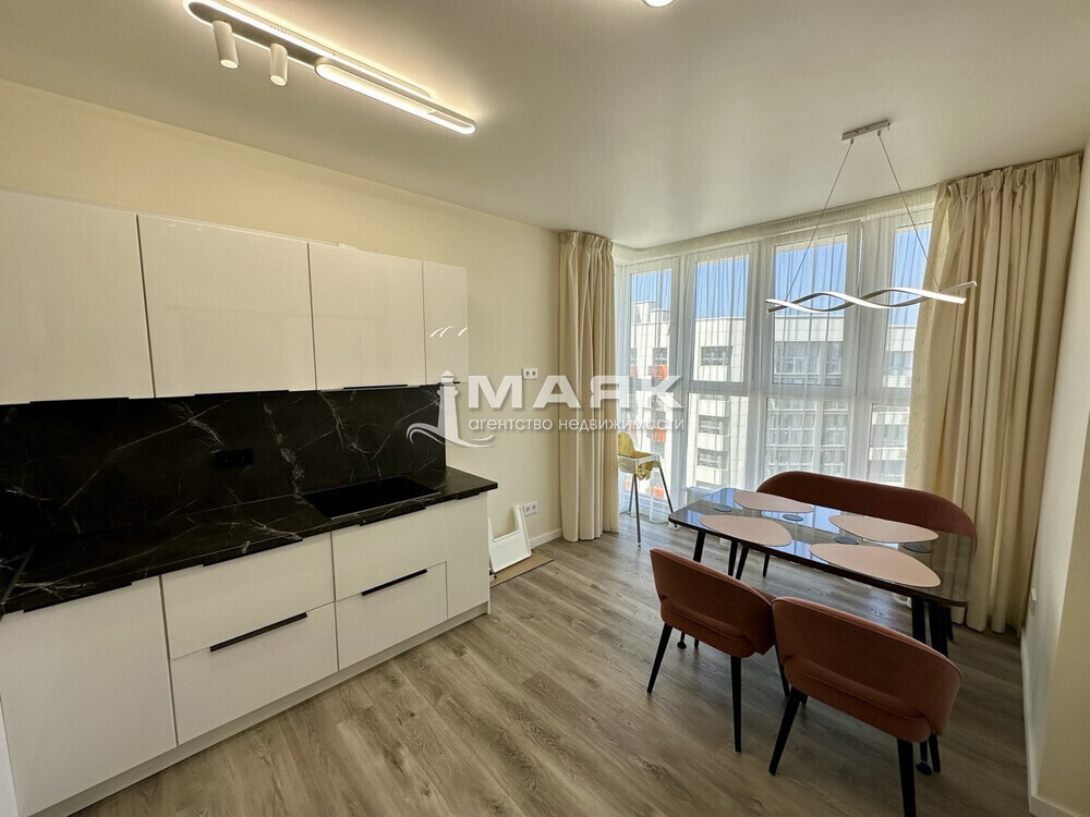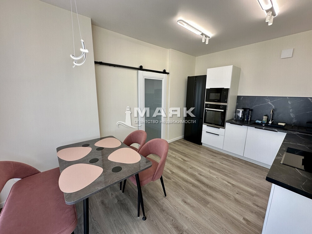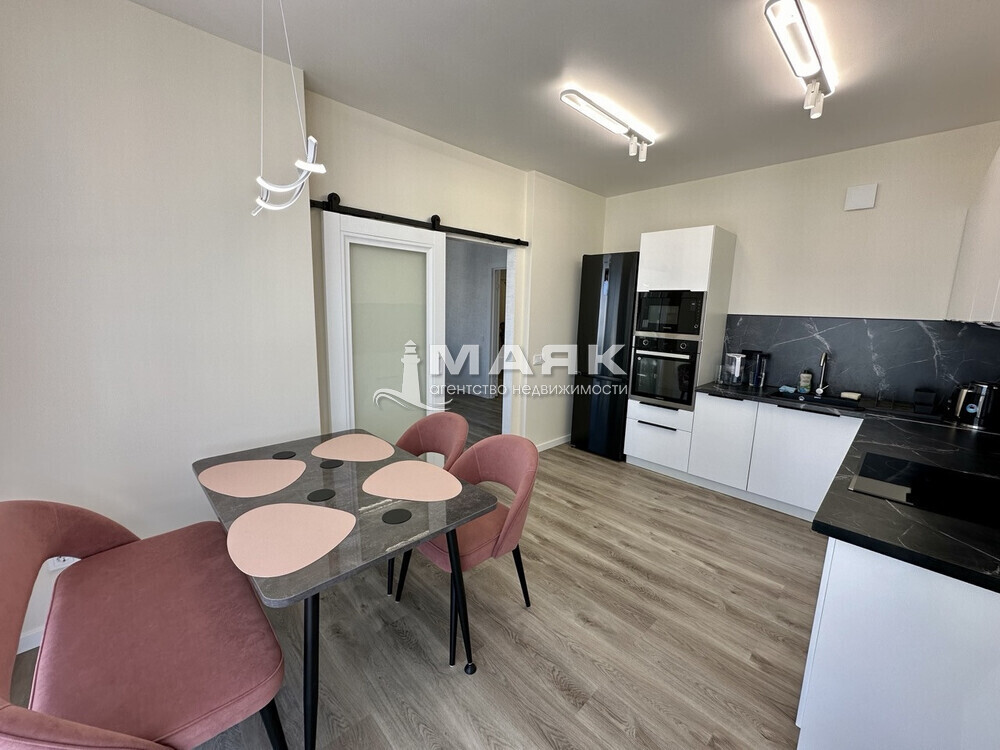• В кухне установлена новая встроенная техника (плита, холодильник, посудомоечная машина), а также стильные кухонные шкафы.