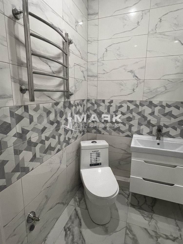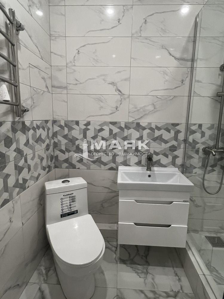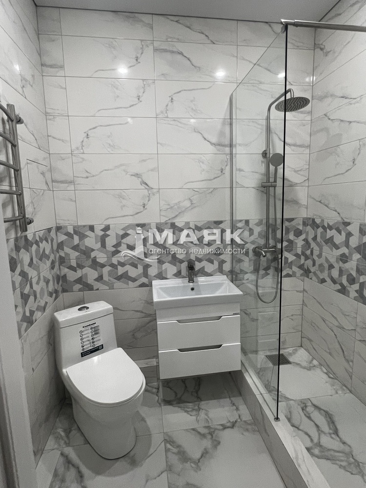 Сан. узел оборудован: душевым поддоном из керамогранита с перегородкой, унитаз, раковина с тумбой, полотенцесушитель. Отделка в сан.узле выполнена керамогранитом.