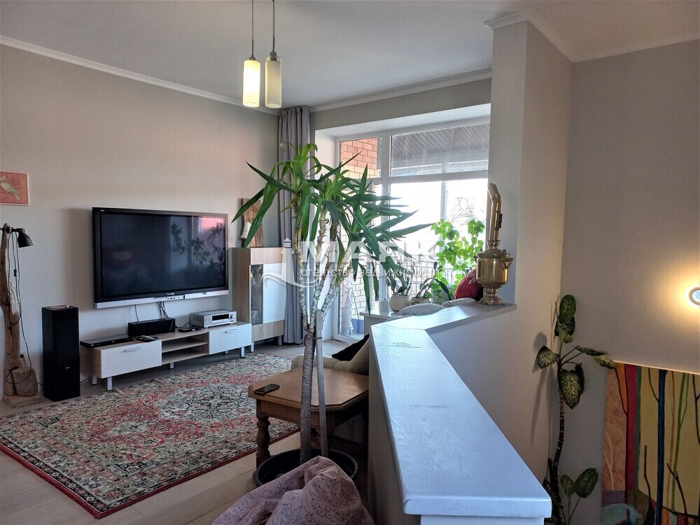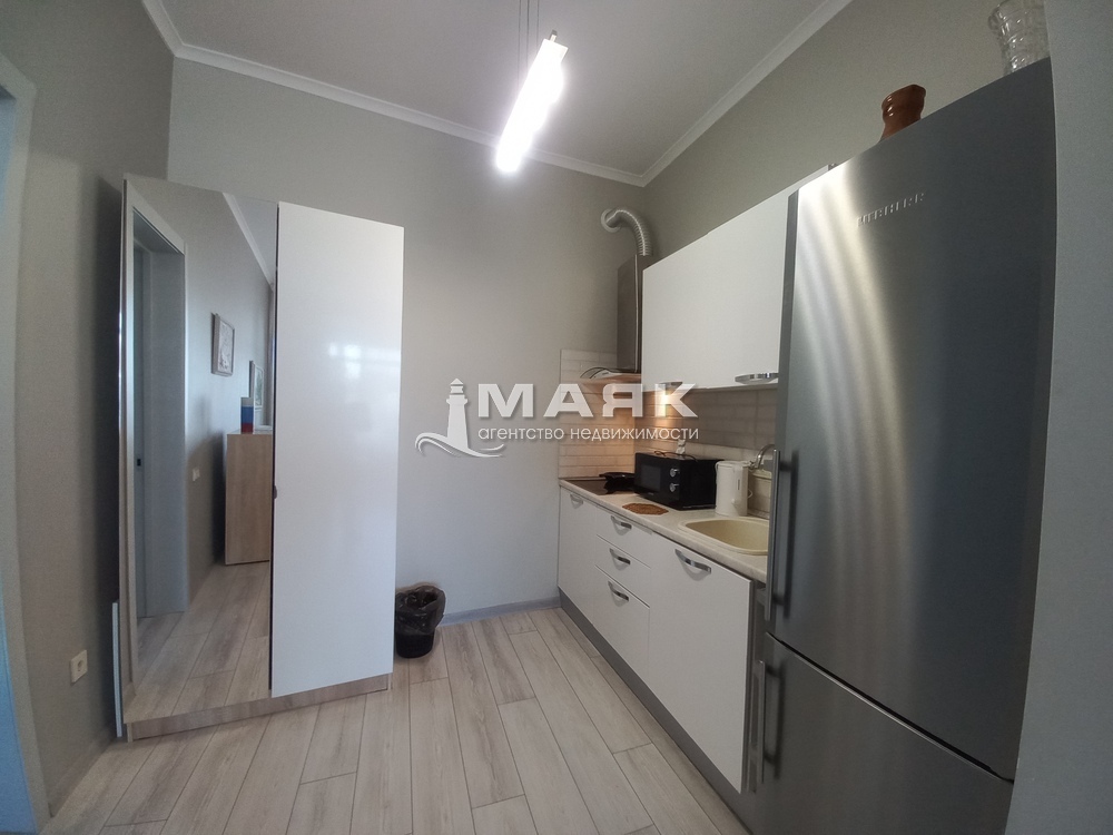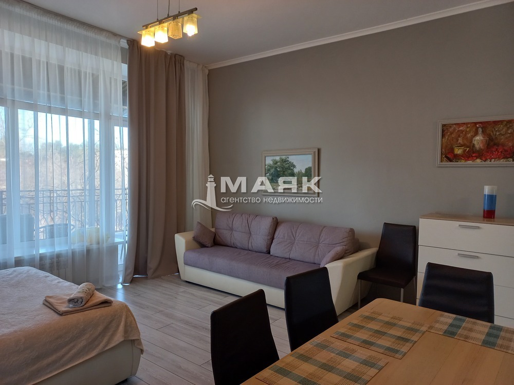 В комнате 1: двуспальная кровать, диван, шкаф, комод, тумбочка, кондиционер, санузел с ванной, кухонный гарнитур, электроплита, холодильник, микроволновка, обеденная зона, выход на террасу.