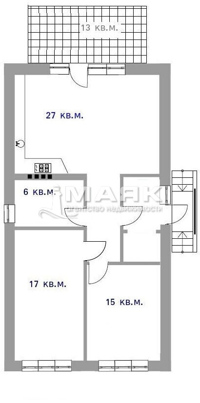 Площадь дома 63 кв.м: продуманная планировка — прихожая, коридор, санузел 6 кв.м с окном, две изолированные комнаты 17 и 15 кв.м, просторная кухня‑гостиная 27 кв.м с выходом на террасу для отдыха.