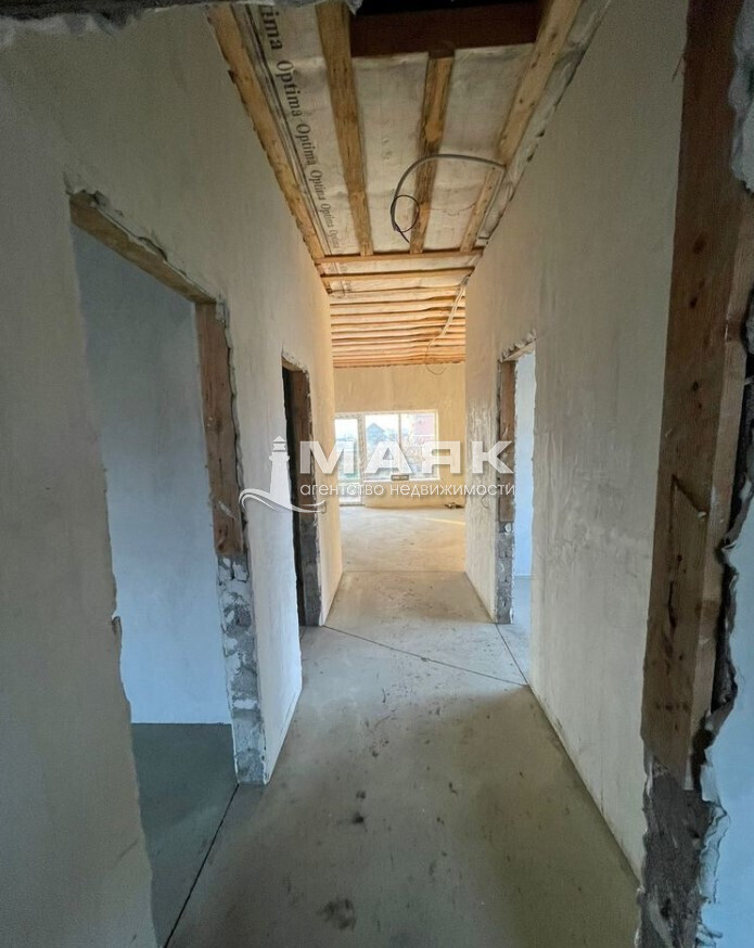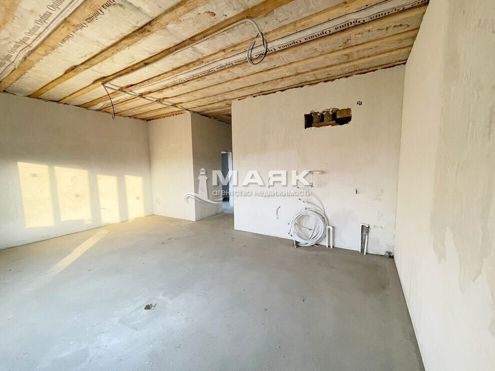 Отделка предчистовая: гипсовая штукатурка стен, выполнена стяжка пола, разведена электрика — остаётся выбрать финишные материалы под свой вкус.