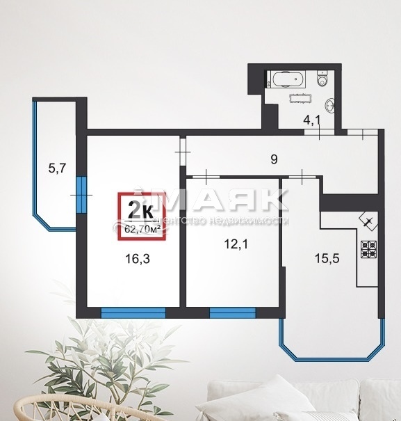 Продается 2-х комнатная квартира площадью 63 м2 с изолированными комнатами и лоджией с витражным окном 5,6 м2