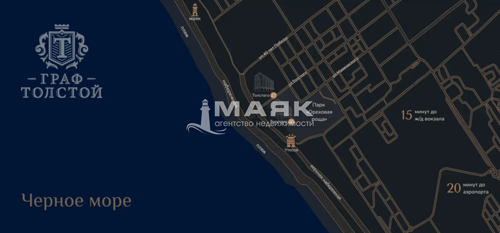 Статусное название «Граф Толстой» — это два семиэтажных корпуса премиальных резиденций. Комплекс находится в одном из самых престижных районов города, на первой береговой линии Чёрного моря.