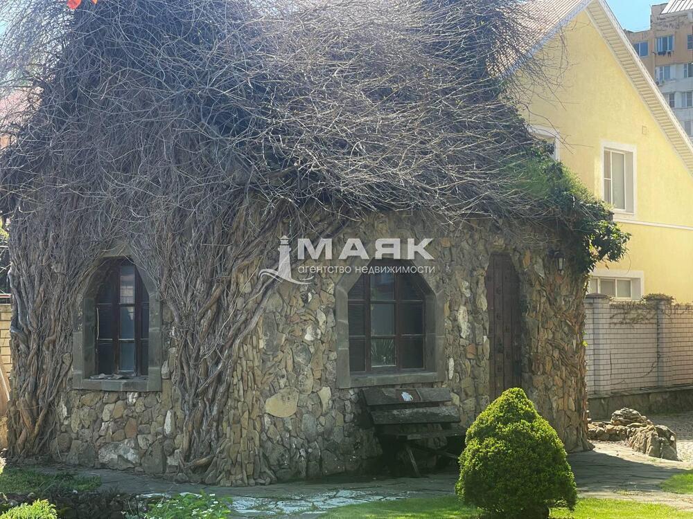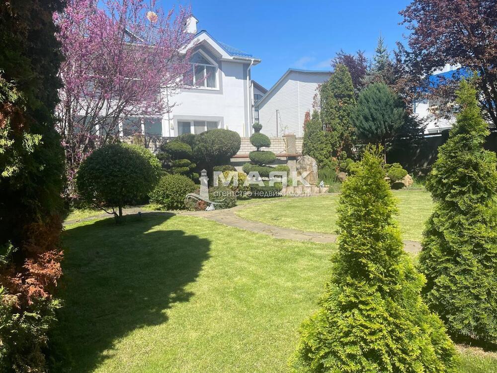 Во дворе выполнен ландшафтный дизайн. Также есть домик для приготовления шашлыка облицованный диким камнем.