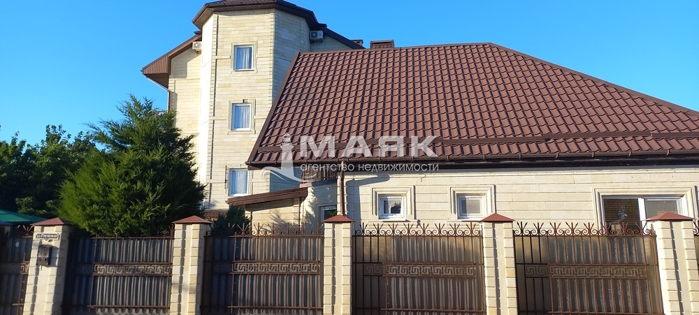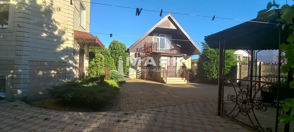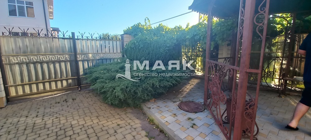 На фасаде просторный двор вымощен тротуарной плиткой, растут кусты магнолии, пушистые вечнозеленые туи, достаточно места для стоянки автомобилей до 10 авто.