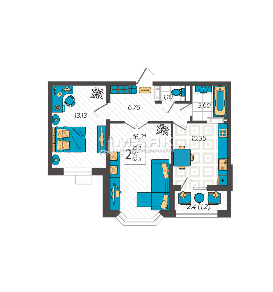 | Площадь (м2) | 52.4 / 29,3 / 10,35 |