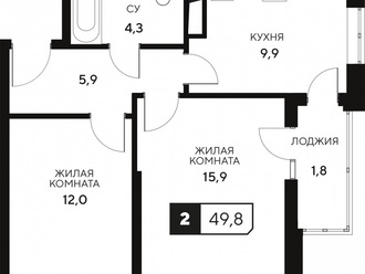 2-к. квартира 49.8 кв.м, 9/15