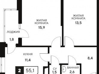 2-к. квартира 55.1 кв.м, 11/15