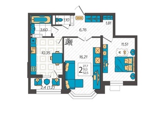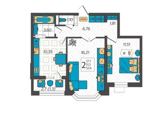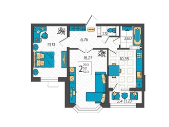 2-к. квартира 52.3 кв.м, 1/9