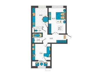 2-к. квартира 58.6 кв.м, 1/9