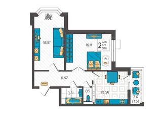 2-к. квартира 59.7 кв.м, 1/9