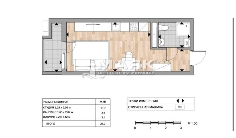 Школа и детский сад через дорогу. Квартира расположена на первом этаже. Площадь студии 28,8 м2.