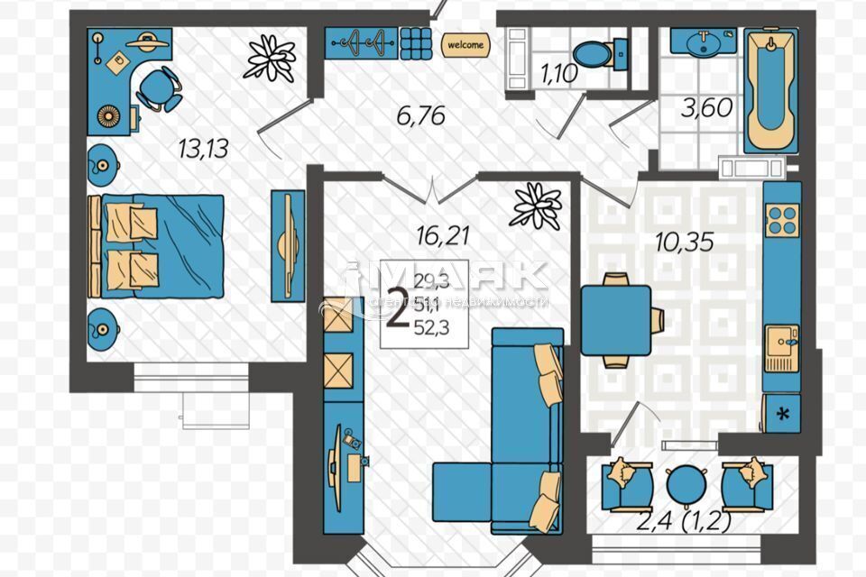 Общая площадь квартиры 53 кв.м