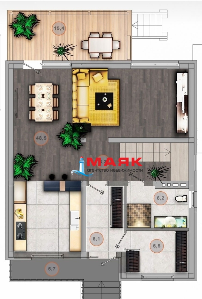 1 этаж: кухня-гостиная-столовая с выходом на террасу, совмещённый сан узел, зона прихожей с местами под гардероб и систему хранения. 2 этаж: 3 изолированные спальни, все имеют выход на балкон, совмещённый сан узел, гардеробная.