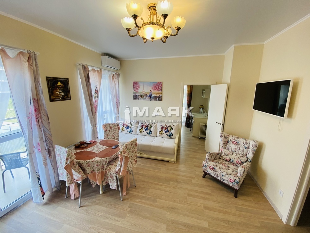 Продается 1-комнатная квартира, 43,4 кв.м, на 2 этаже 7-этажного дома, просторный балкон 7 кв.м., с балкона открывается чудесный вид на горы, и бассейн.